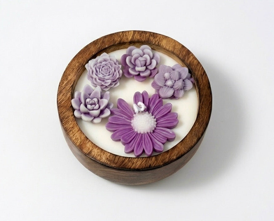 sculpted petals in deep violet, resting in a dark sheesham wood bowl like a garden that chose the dark.