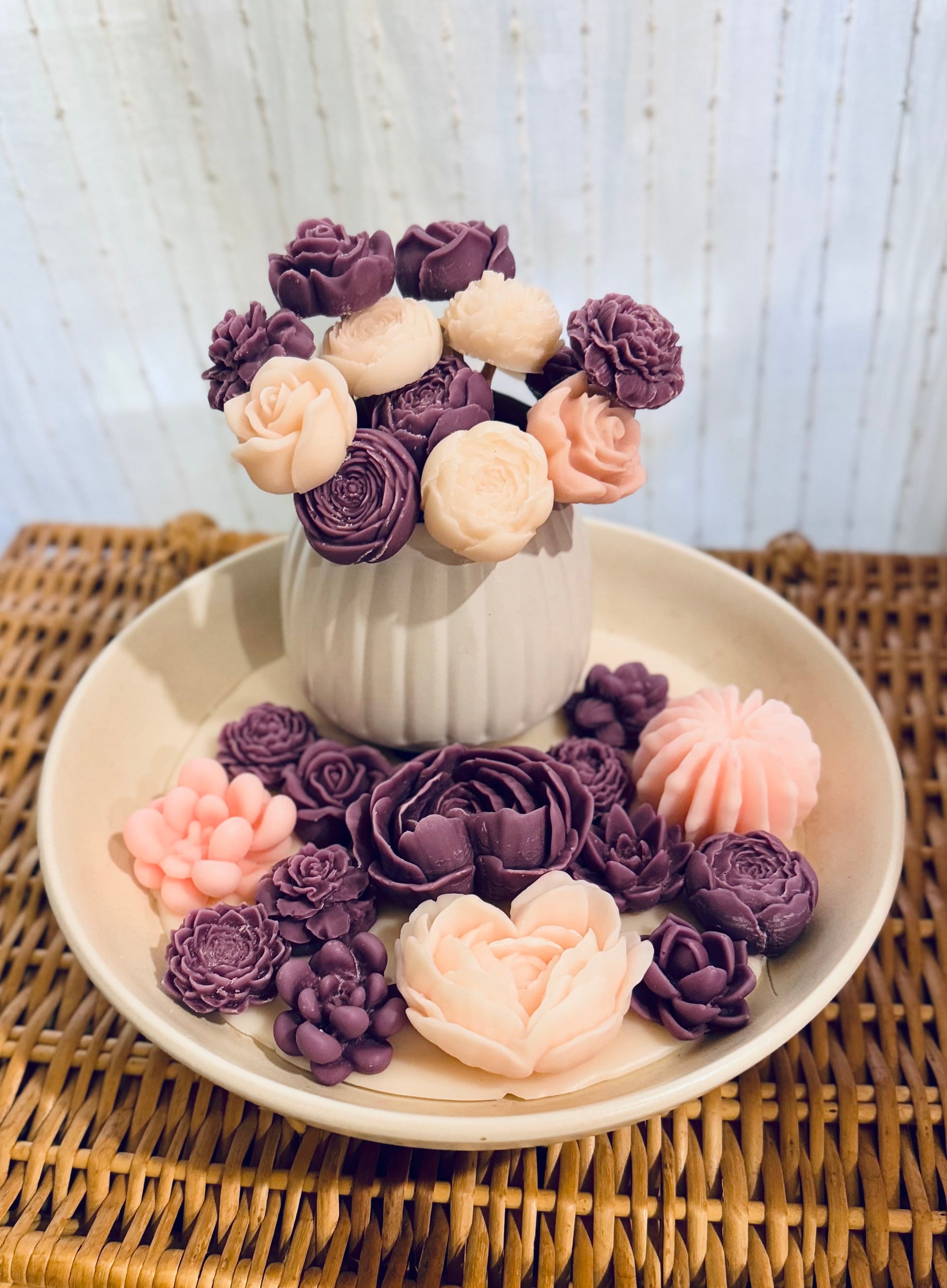A curated floral arrangement of artisanal candles roses, peonies, and succulents—set in a ceramic vase and dish for that adorning your table for those special conversations. Each bloom is sculpted to evoke nature’s elegance, offering a visual and aromatic experience that lingers like a memory.